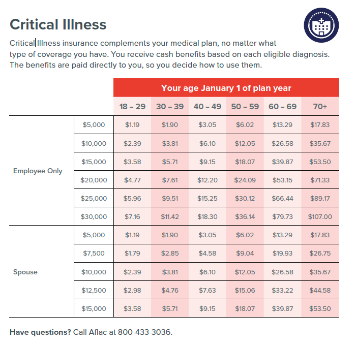 Aflac’s Critical Illness plan provides ability for an insured to receive a lump sum benefit payment upon first and second diagnosis of any qualified critical illness. It is a supplemental option to your medical plan, no matter what type of coverage you have.