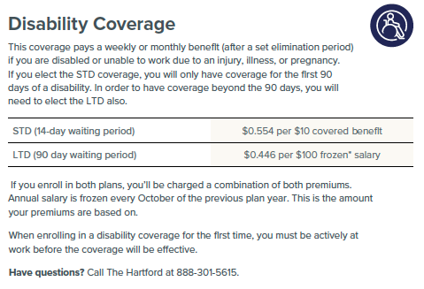 Disability coverage helps replace a portion of your income if you’re unable to work due to an injury, illness or pregnancy. The district offers coverage through The Hartford.