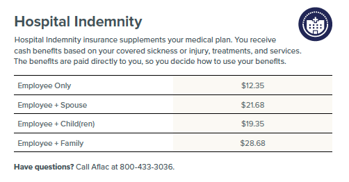 The Aflac Group Hospital Indemnity plan benefits include the following: