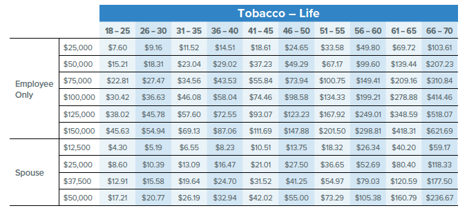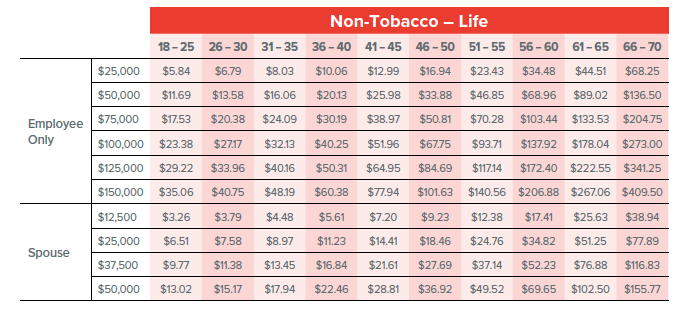 The employee’s spouse may also be enrolled for a benefit of 50% of the employee’s benefit. The premiums for spouse coverage are based on the spouse’s age at the time of enrollment.