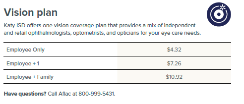 For a complete list of benefits, copays and providers, visit Aflac Vision or call KISD's dedicated VISION line at 800-999-5431